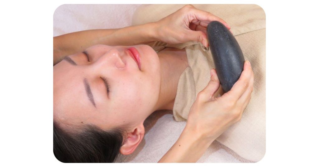 100度に温めた温石で、全身の経絡や経穴に沿って施術をすることで、コリや筋肉のこわばりをほぐしながら、全身の巡りを整えていきます。