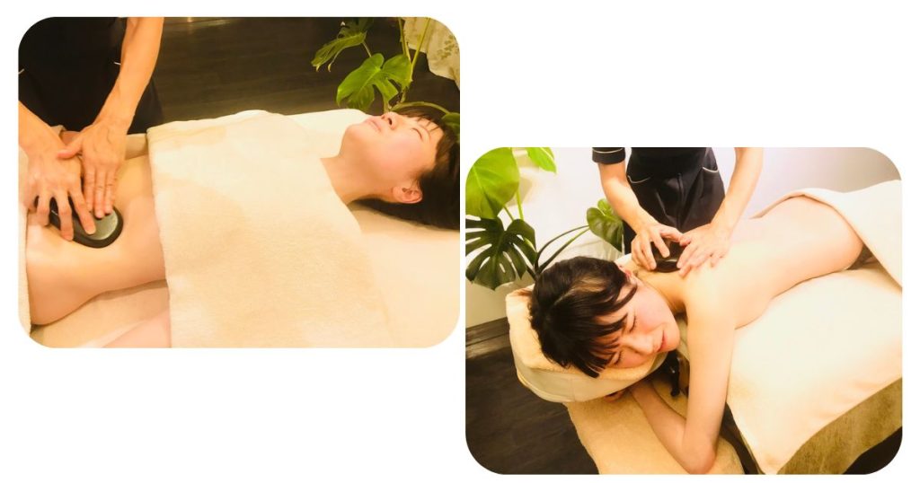 60度に温めたホットストーンを使って全身の筋膜リリース&リンパトリートメントをしたあとに、しっかりと腸もみをいれていきます。